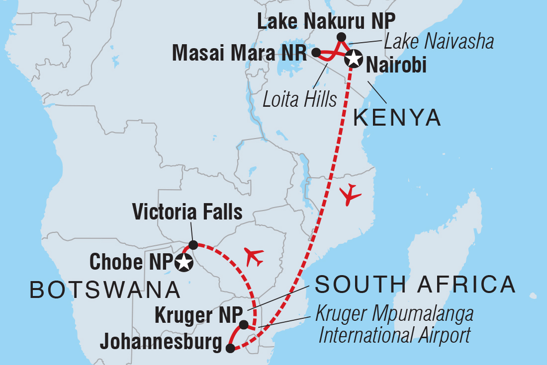 Visit a local Maasai community known for championing Maasai women’s health and education. During this Exclusive Experience, you’ll be welcomed by traditional Maasai warrior song and dance and learn about this remarkable and ancient culture., Get in touch with nature during two nights at your lodge Feature Stay in a private reserve within the Greater Kruger Region. Sleep in comfortable chalets with outdoor showers, and private terraces connected by wooden pathways through the bush., Enjoy a small and intimate sunset river cruise on the Zambezi River, a Premium Exclusive Experience. A private chef will prepare canapes and drinks as your boat navigates the islands above the thundering Victoria Falls., Spot Chobe National Park's abundance of wildlife and the world’s highest concentration of elephants from multiple vantage points with an early morning 4x4 game drive and an afternoon boat cruise along the picturesque Chobe River., Enjoy three unforgettable nights at your Feature Stay camp, located with easy access to the Maasai Mara Game Reserve. Search for lions and cheetahs prowling the park on several 4x4 game drives, and enjoy sunset drinks within the park.