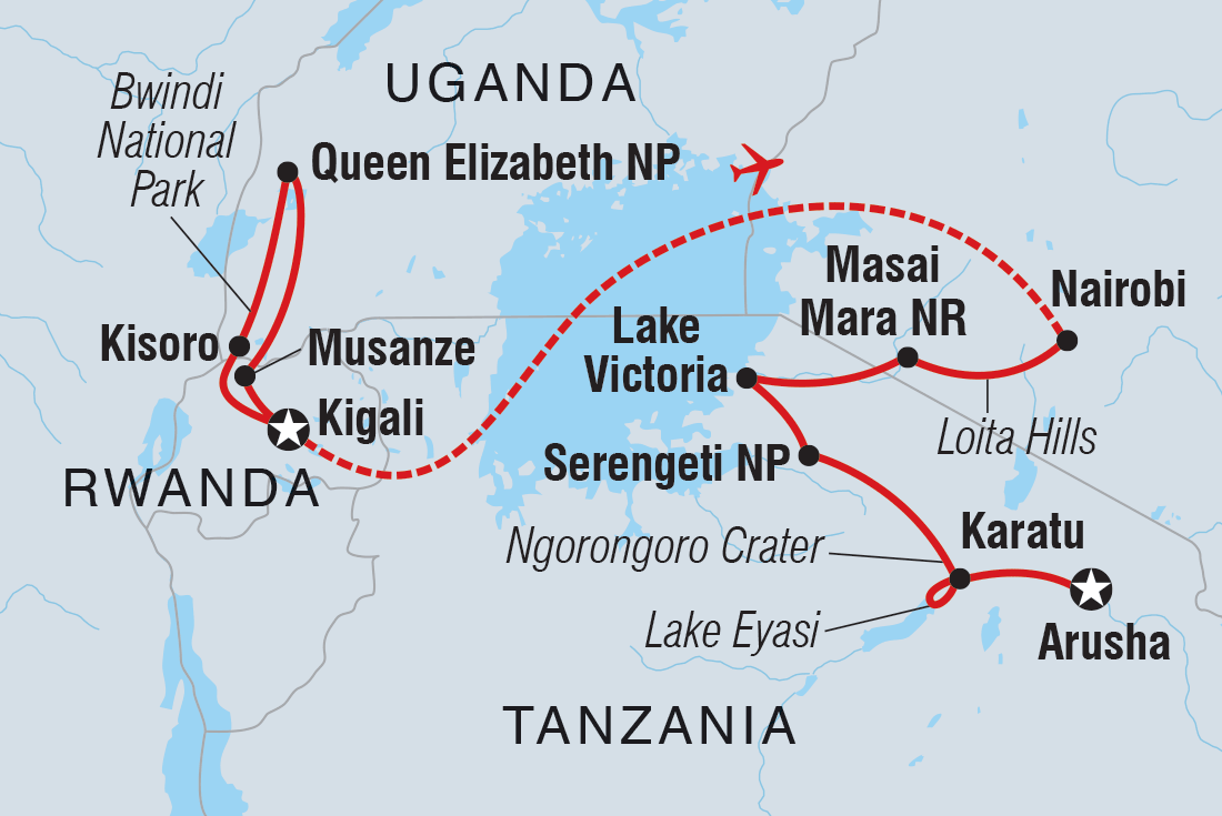 No two journeys in Africa are identical. Be prepared for travel times to be longer or shorter than advised. Weather and road conditions can change things significantly, so embrace the detours, shortcuts, and unforgettable moments along the way., The sheer thrill in coming across a habituated group of gorillas, dominated by a great male silverback, is unbeatable. But please keep in mind that tracking gorillas in the dense forest can sometimes be wet, muddy and uncomfortable. The terrain is by no means easy either, so it can be pretty strenuous and often humid. You need to be prepared and fit enough to walk up to 4 hours up and down hills., Staying in a permanent tented camp in the Serengeti National Park, with no barriers between you and the animals, is amazing, but it's important to heed the safety advice of your leader., This is a 4WD overland trip. That means you’ll be travelling with a group in 4WD vehicles, visiting remote communities and world-renowned wildlife parks. The drive days can be long, but it’s as much about the journey as the destination, and half the fun is the camaraderie., There will be many early starts, either to make use of the better safari time or to beat the morning traffic on long travel days., The day-to-day itinerary features a selection of optional activities. Please note that this list is not exhaustive and is intended only as a guide. Prices are approximate and may change at the discretion of the local provider, and all activities are subject to availability.