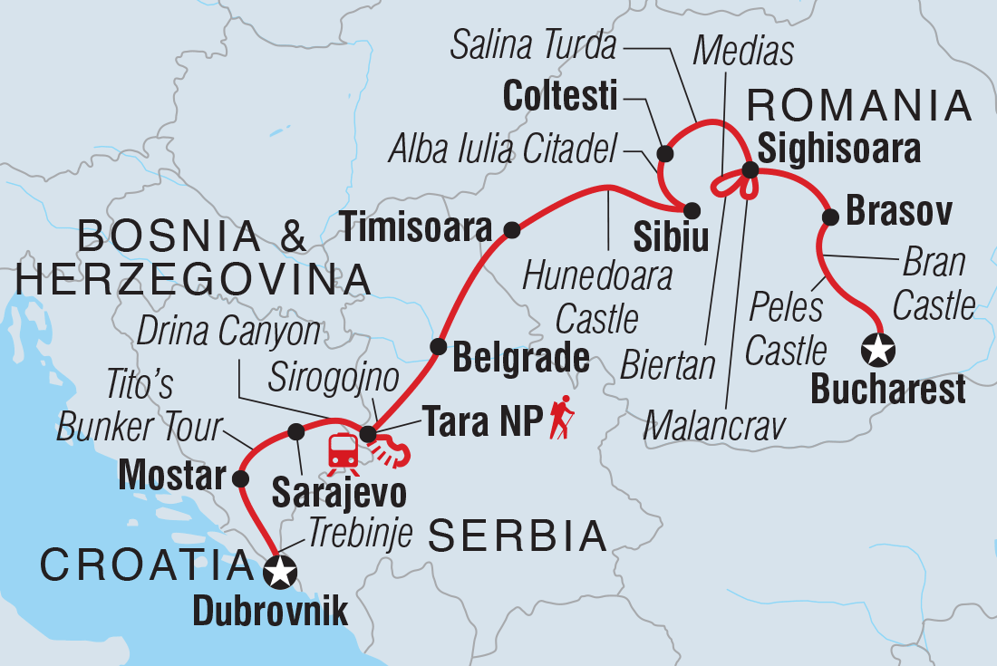 Take a scenic steam train ride through Tara National Park’s forests and mountains on a historic railway that forms part of the famous Ciro trail connecting Belgrade and the Adriatic Sea, a Premium Exclusive Experience., Explore Balkan history, discovering Saxon villages with fairytale scenery, medieval Old Towns with pretty market squares, and Orthodox monasteries where you'll taste the famous Tvrdos wine made by its monks., Step into another world as you walk through ancient halls and hear the myths and legends surrounding some of the most impressive castles in Eastern Europe – Bran and Peles., Dive deep into one of the oldest salt mines in Europe, in use for about 2,000 years. Spanning more than 43 kilometers (27 miles), Turda Salt Mine contains a huge array of attractions – from an amusement park to a contemporary art museum to an underground lake., Tour one of the best-kept secrets in former Yugoslavia, Tito's nuclear bunker, which was built to protect Yugoslav President Josip Broz Tito and his top military advisors.