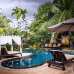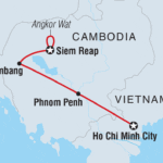 Travel by public bus across the border, through rural Vietnam and Cambodia to Phnom Penh. Cambodia's capital city is set on a major junction of the Mekong and Tonle Sap rivers and boasts some fine examples of French-inspired architecture. If you're looking for a tasty beverage when you arrive, maybe head for a mojito on the rooftop. Or if you're in the mood for shopping, maybe stop in at the art-deco Psar Thmei (Central Market) or travel out to Psar Tuol Tom Pong (the Russian Market) for the best range of local souvenirs.